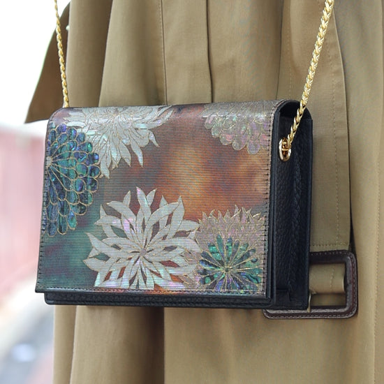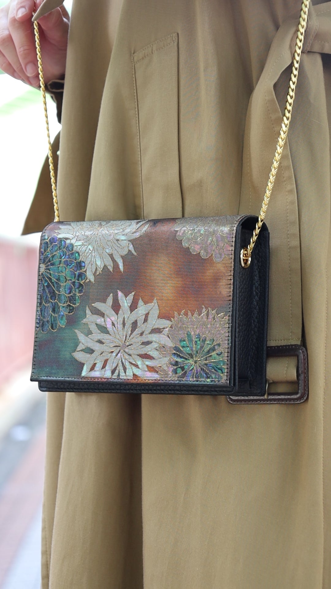 螺鈿織工芸帯の技法を駆使したマザーオブパールの輝く生地に世界最高品質のトリヨンレザーを併せ、日本の確かな縫製技術で完成させました。チェーンストラップは取り外し可能なため、ハンドバッグとしてもお使いいただけます。